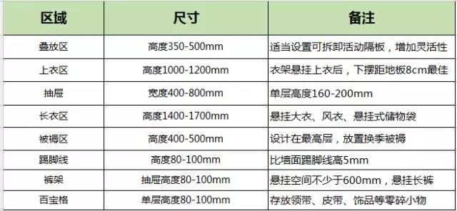 ● 收納工具太少 完美的衣柜必須有百寶格,平常放些服飾配件,如:內(nèi)衣、皮帶、襪子等。方便存取,也省的這些小食品弄得到處都是,或者掛壞衣服。 ● 衣柜同一尺寸 如果是定制衣柜的話,建議根據(jù)家人的不同身高和需求來定制,如果是買成品衣柜,盡量選擇一個折中的尺寸,滿足家里每個人的身高。此處奉獻一個衣柜的黃金尺寸表: