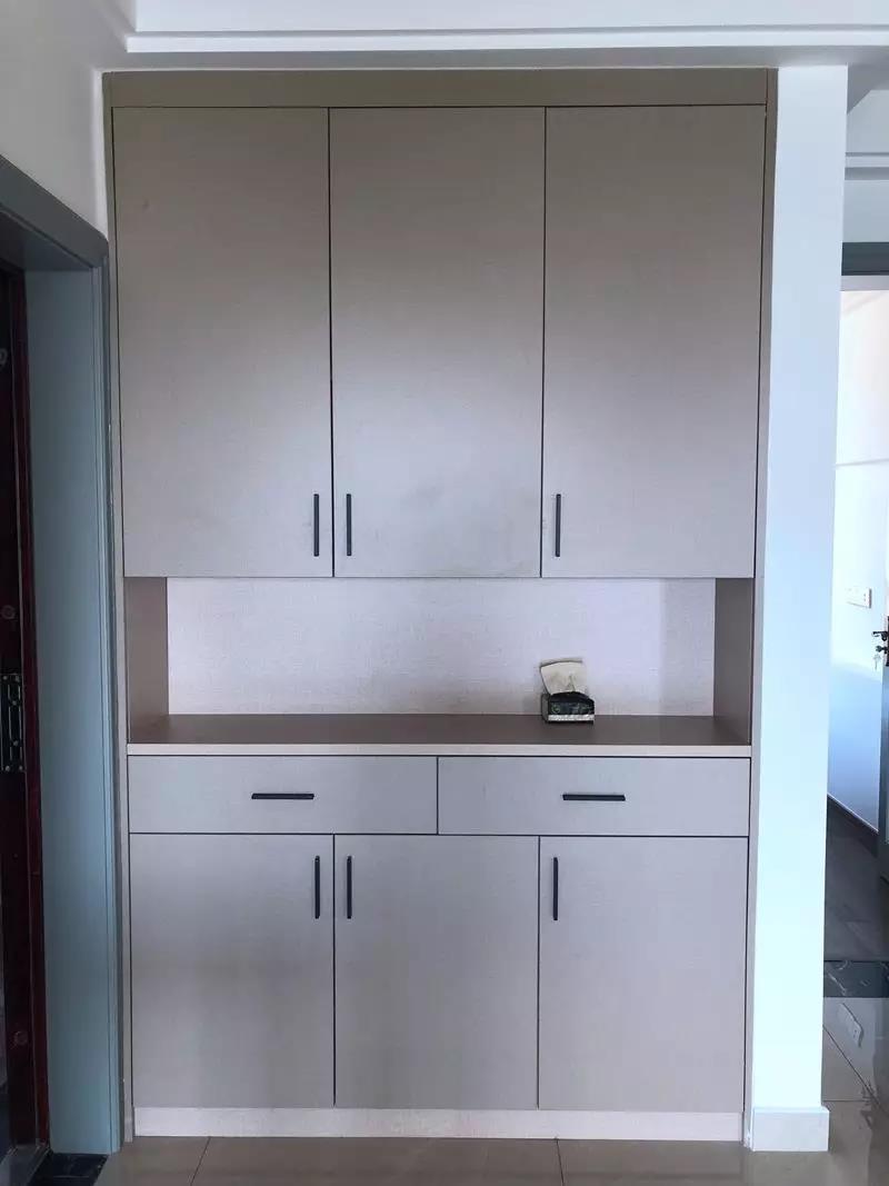 進(jìn)門玄關(guān),嵌入式柜體,方便收納鞋、閑置物品,業(yè)主回家時也能把包、鑰匙放置在這里,顏色與陽臺柜體一致。