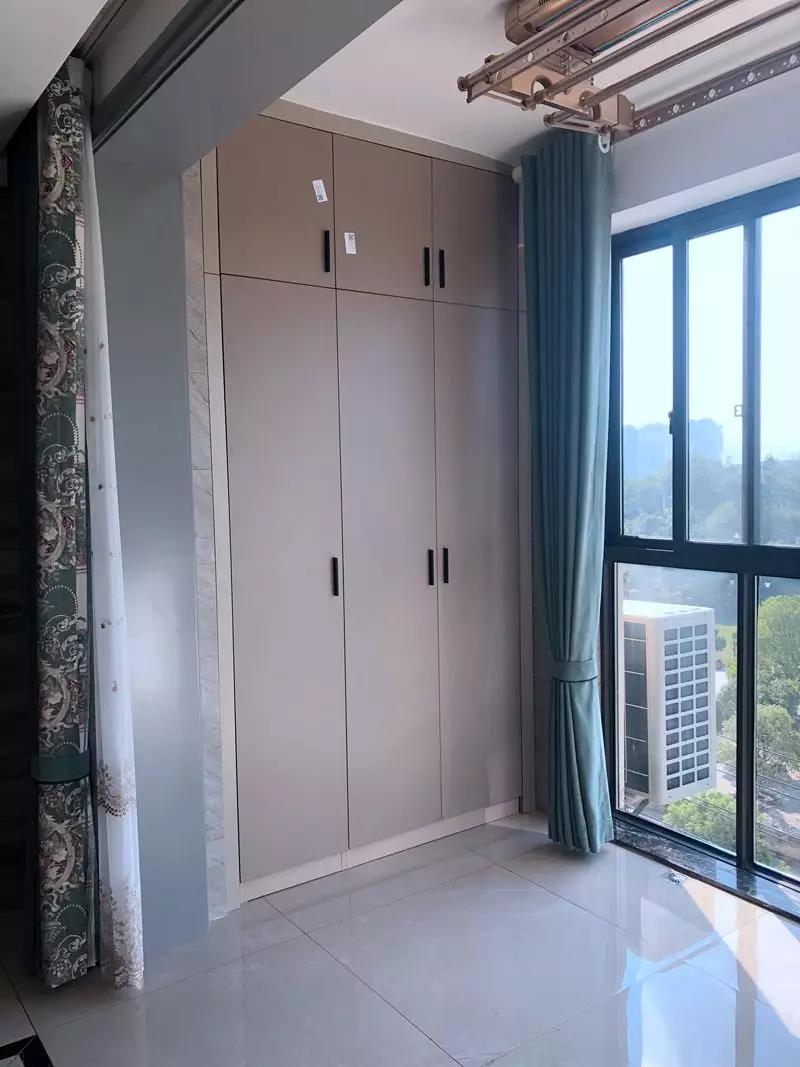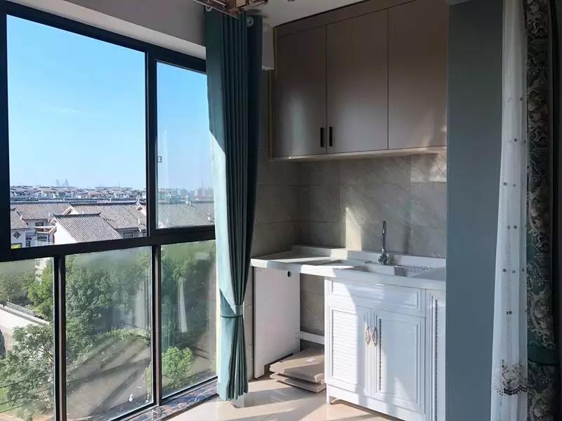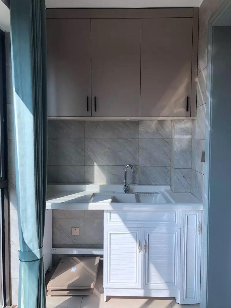 陽臺和客廳中間利用窗簾作為空間隔斷,兩側(cè)分別是整面嵌入式柜體和洗衣臺的設(shè)計,也是一個收納空間。