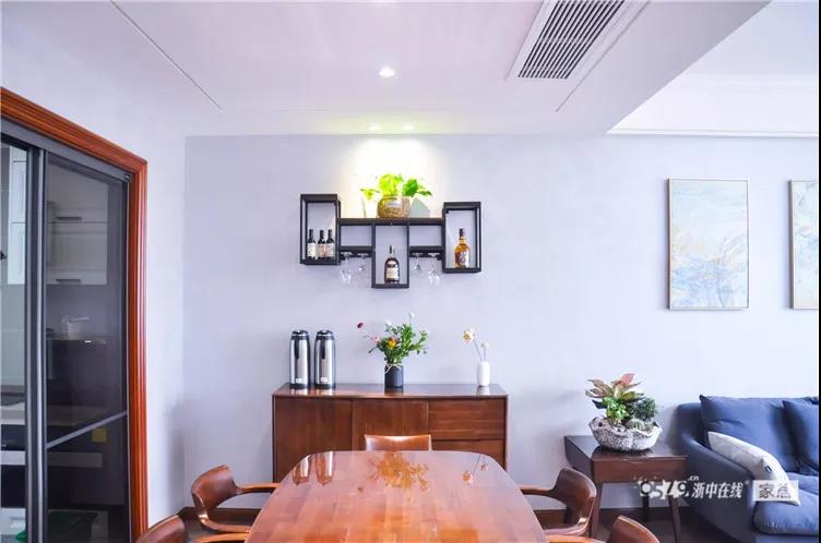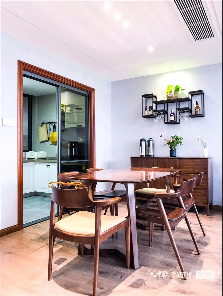 客餐廳互通,并以功能性家具規(guī)劃出場域,淺棕色木質(zhì)餐桌椅與色調(diào)一致的餐邊柜, 和諧統(tǒng)一,搭配墻面金屬酒架,滿足儲(chǔ)物與展示功能,大方雅致。