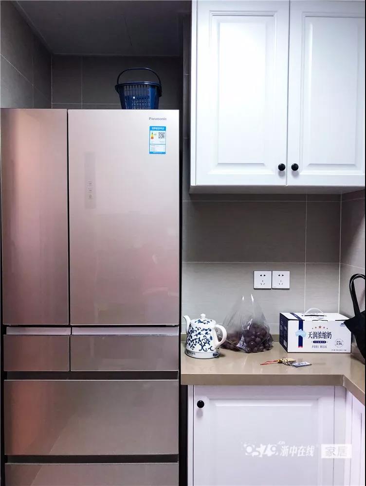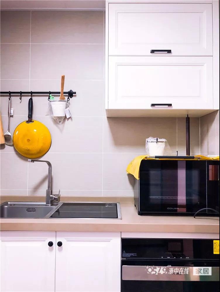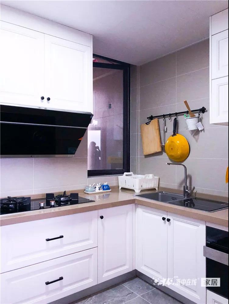 廚房是半敞開式的,玻璃推拉門讓采光變得通透,純白色的櫥柜搭配黑色烤漆簡潔大方。