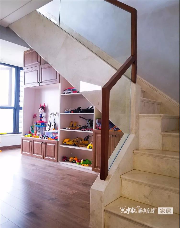 樓梯間的空間設(shè)計(jì)成了小盆友的游樂空間,半展示功能的柜子陳列著小盆友的諸多玩具。