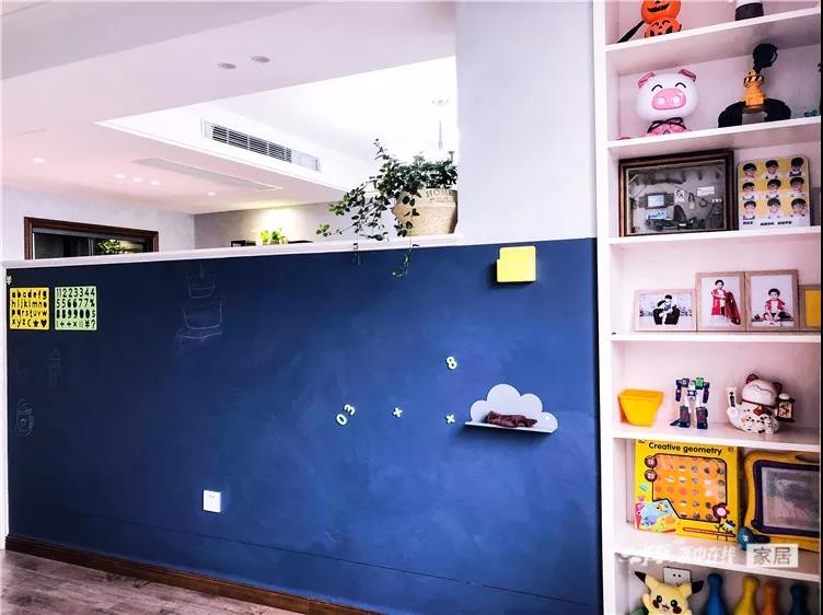 創(chuàng)意黑板墻方便小盆友發(fā)揮想象力和創(chuàng)造力,深藍(lán)色的墻面童趣又不失美觀。