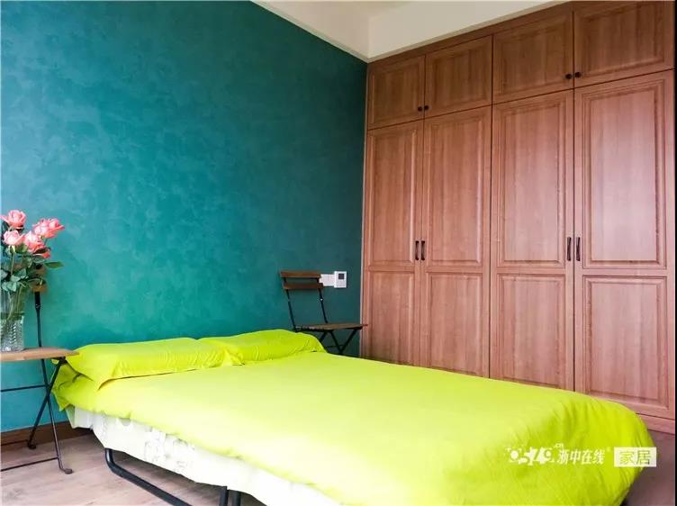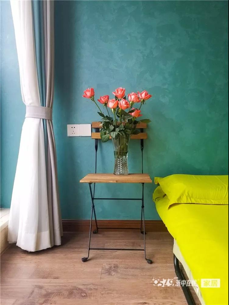 次臥后期是準(zhǔn)備作為書房使用,瑩果綠的床品搭配孔雀藍(lán)的墻面, 女主人精心搭配的花藝,帶來別具一格的視覺效果,!
