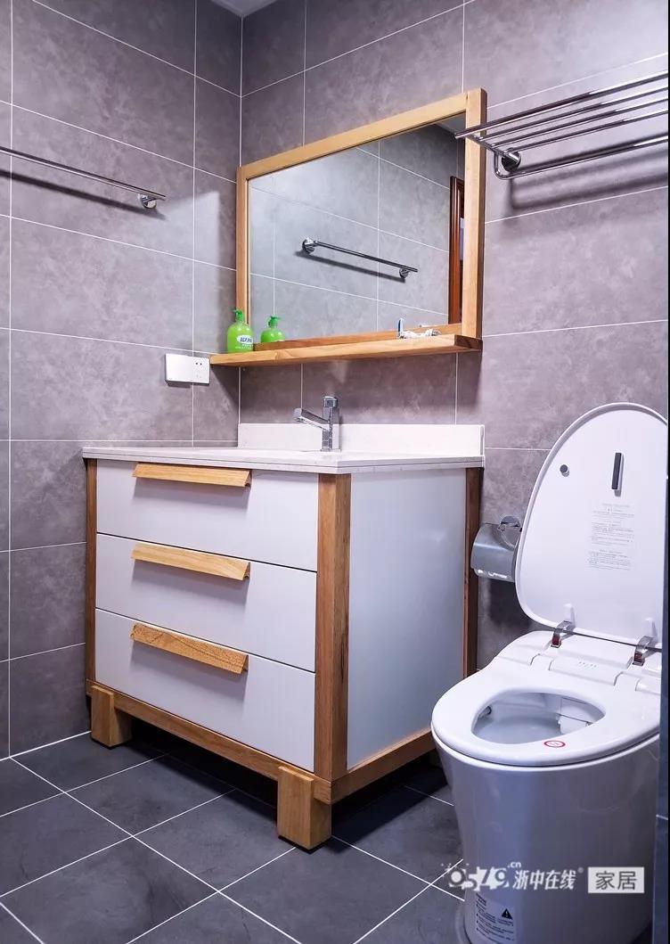 樓上樓下各有一個(gè)衛(wèi)生間,灰白色調(diào)空間干凈、明亮,搭配白色洗漱柜和原木色邊框,清新又精致。