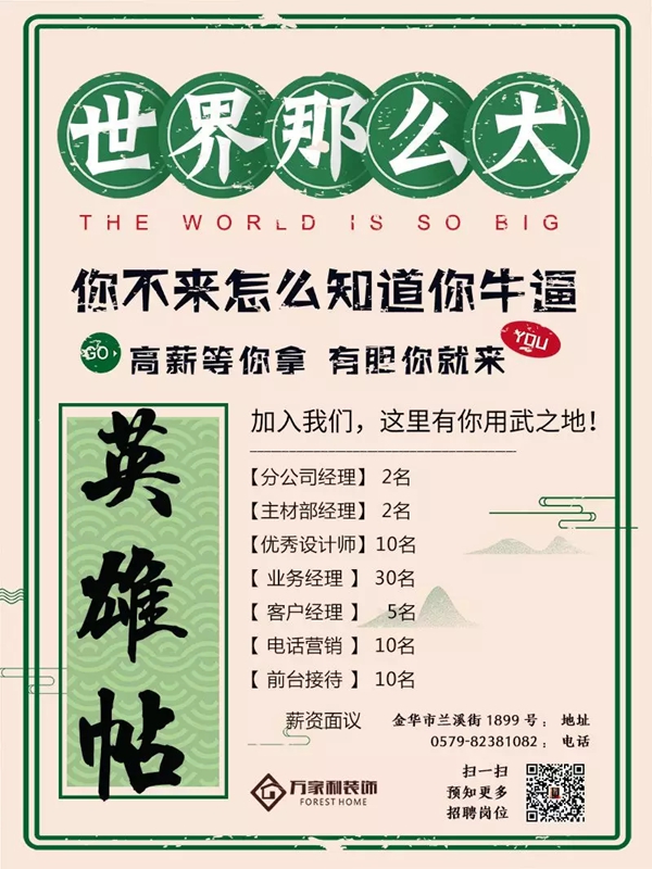 新年新氣象 新的工作征程已經(jīng)開始了, 小編懷著無比激動的心情 告訴大家 萬家利裝飾招人啦! 萬家利裝飾招人啦! 萬家利裝飾招人啦! 不管你是何方神圣 只要你有能力有經(jīng)驗(yàn) 我們隨時等你來撩 ▼
