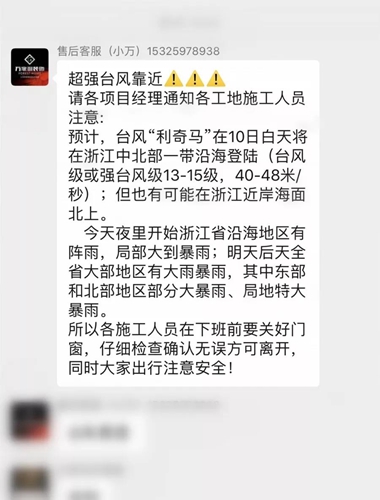 超強(qiáng)臺(tái)風(fēng)登陸的消息 也引起了工程部小伙伴們的重視 昨天開始 對(duì)在建施工工地進(jìn)行緊急通知 要求各施工人員在下班前要關(guān)好門窗 以保證業(yè)主施工現(xiàn)場(chǎng)安全