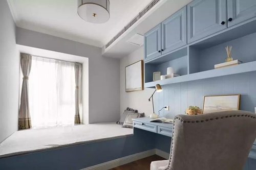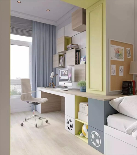 有窗戶的房間,最好在窗戶的地方做一組學(xué)習(xí)桌, 學(xué)習(xí)時光線比較充足,書桌的設(shè)計要最大程度地利用空間。