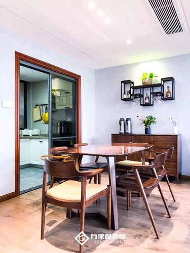 淺棕色木質(zhì)餐桌椅與色調(diào)一致的餐邊柜,相互映襯。復古的臺燈搭配原木色的家具、深色的床品,素雅不失溫馨。