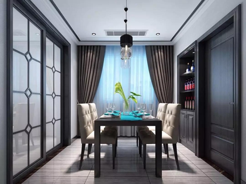 方形餐桌,搭配皮質(zhì)餐椅,餐桌上方掛上造型別致吊燈,設(shè)計(jì)感和品位十足。 餐邊柜充分利用了現(xiàn)有空間并提升了家中的物品收納能力,實(shí)用方便。