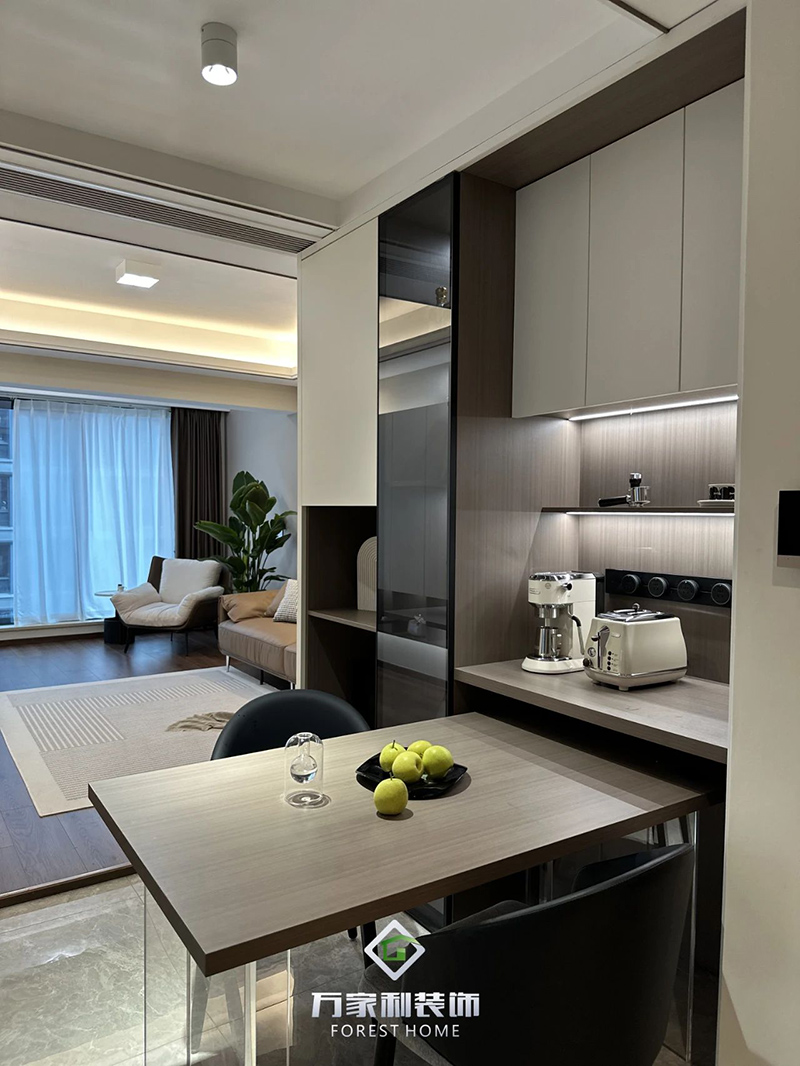 去繁就簡(jiǎn)的配色處理,彰顯優(yōu)雅的格調(diào)。餐邊柜結(jié)合嵌入式的餐桌設(shè)計(jì),使用靈活方便,空間利用更合理。