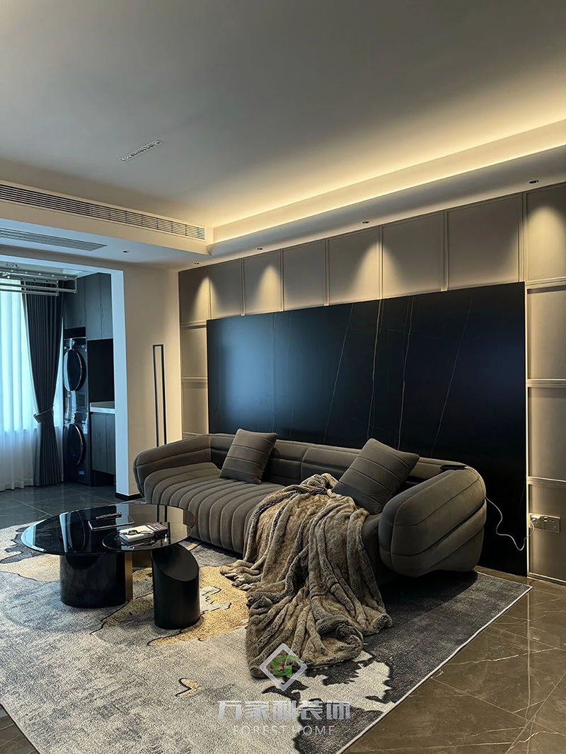 客廳選用了意大利香蕉布藝沙發(fā),低調(diào)的色彩與舒適的質(zhì)感完美結(jié)合,暗黑色調(diào)的背景與沙發(fā)柔和的線(xiàn)條形成強(qiáng)烈的對(duì)比,柔軟與硬朗相融,營(yíng)造出高級(jí)感。