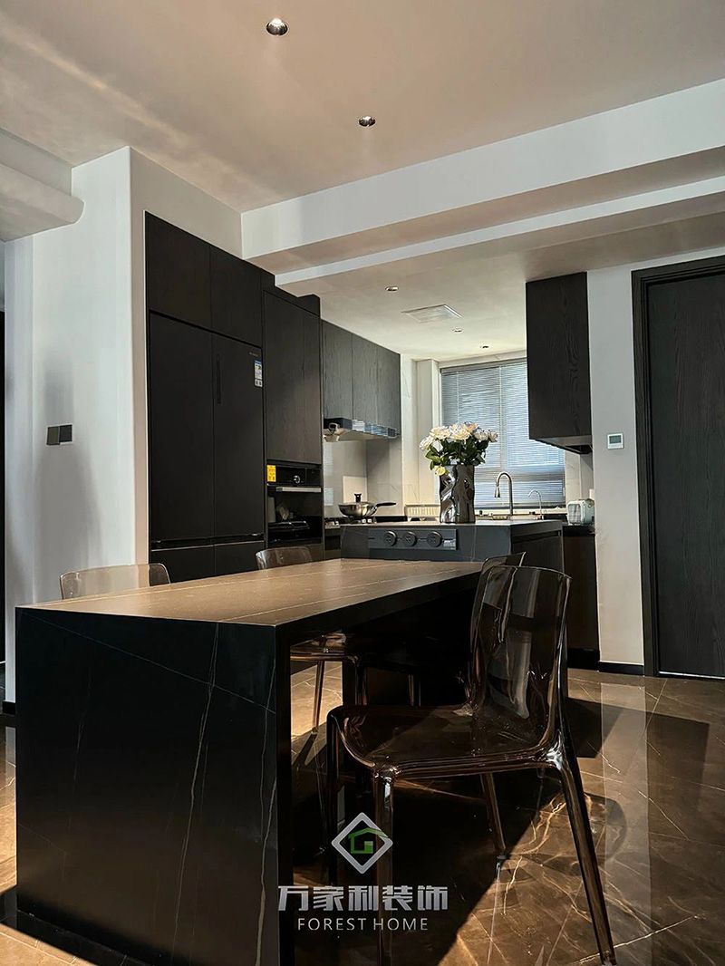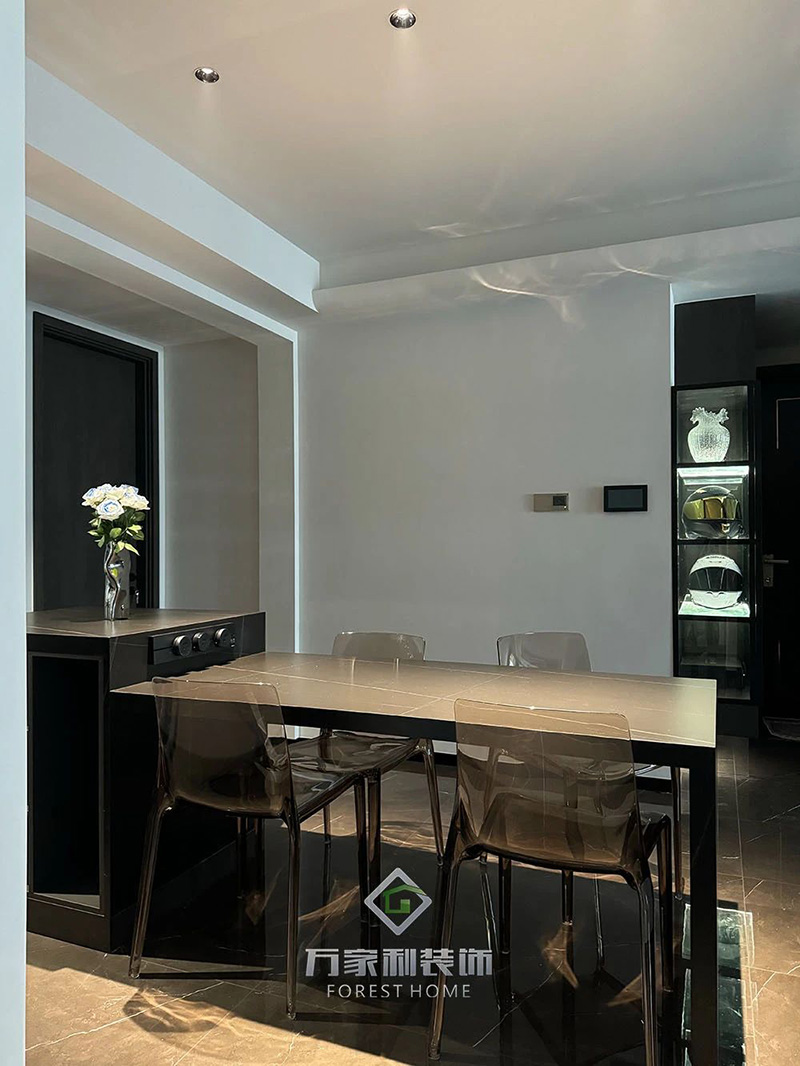 餐廳的透明亞克力餐椅為暗色空間增添輕盈感,簡(jiǎn)約設(shè)計(jì)中帶有未來(lái)感,更讓整個(gè)暗色調(diào)的空間顯得不沉悶。