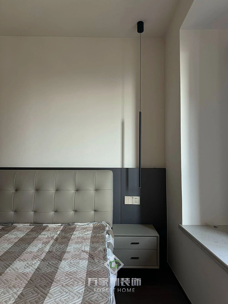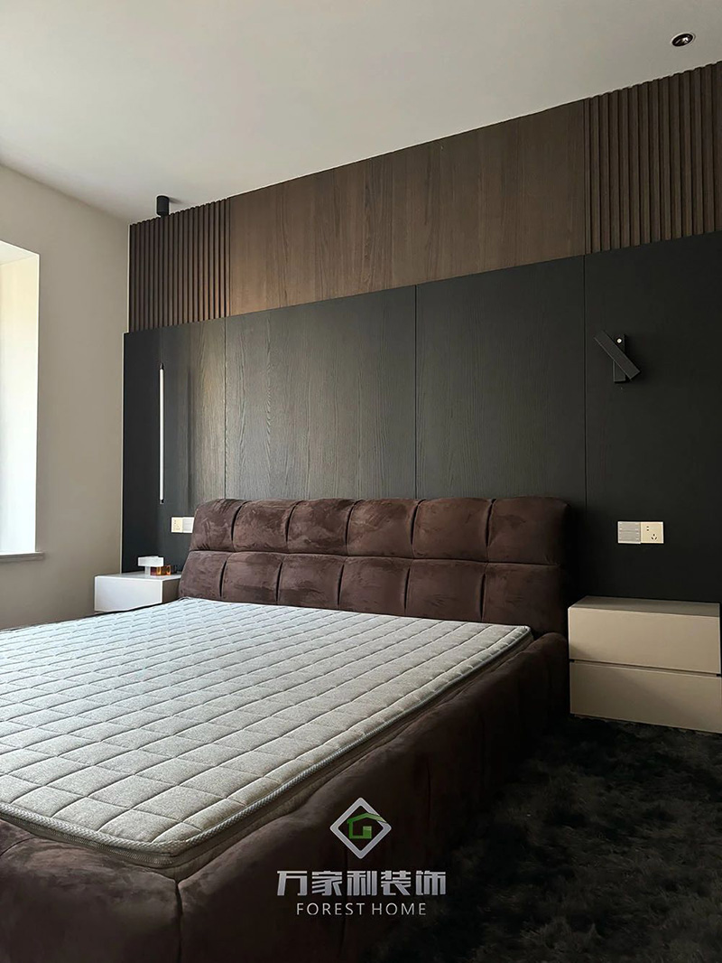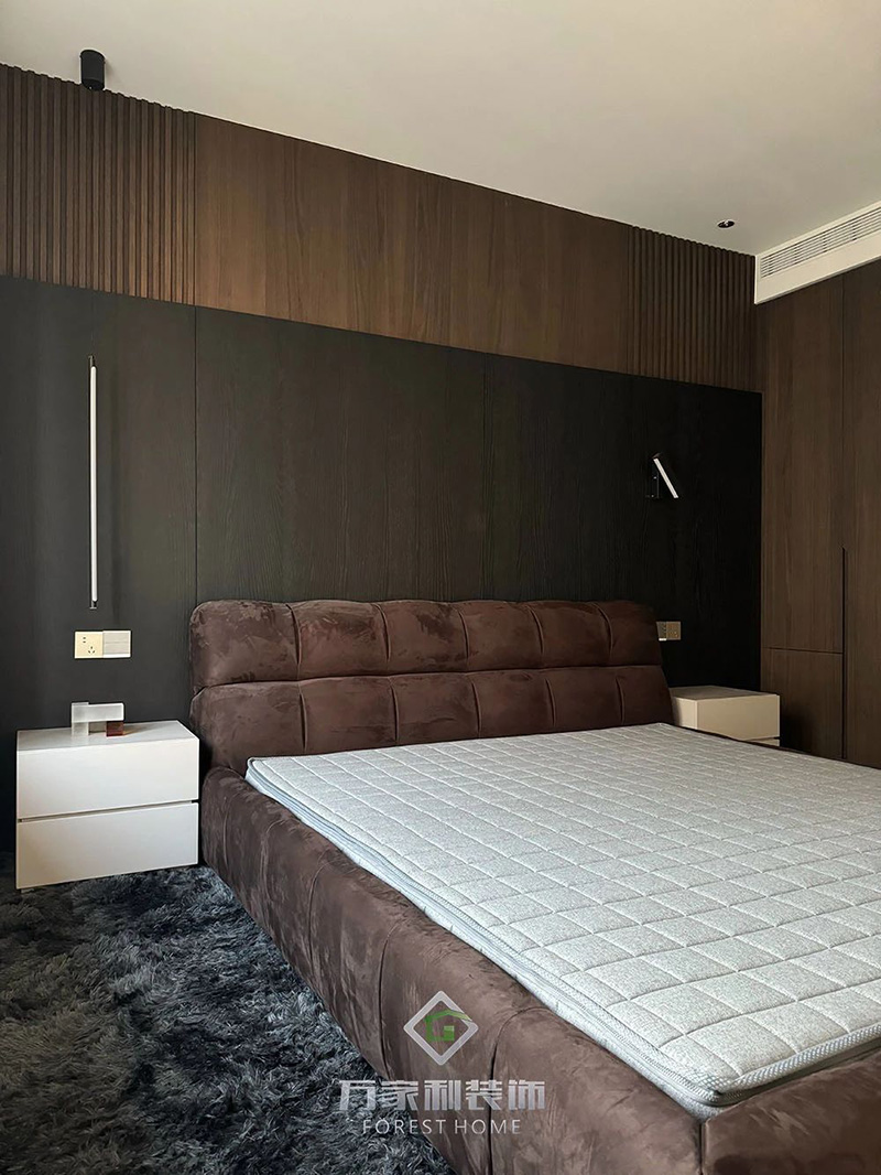 輕奢泡芙床與栗棕色木板背景墻:沉穩(wěn)溫暖的臥室氛圍,帶來(lái)極致放松體驗(yàn),打造舒適的睡眠環(huán)境。