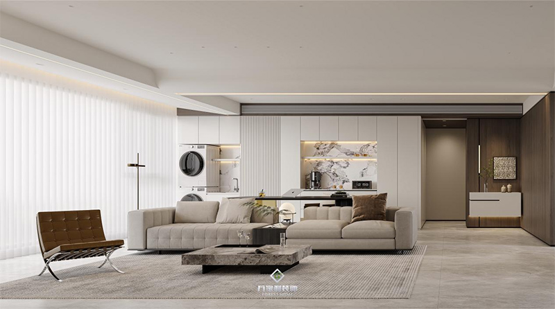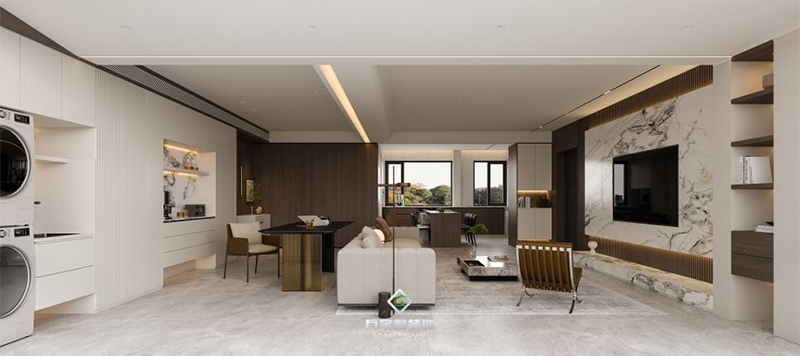 橫廳布局,沒有模板化的布局,以沙發(fā)為界,一半會客廳一半是書房,客廳功能也更為多元。