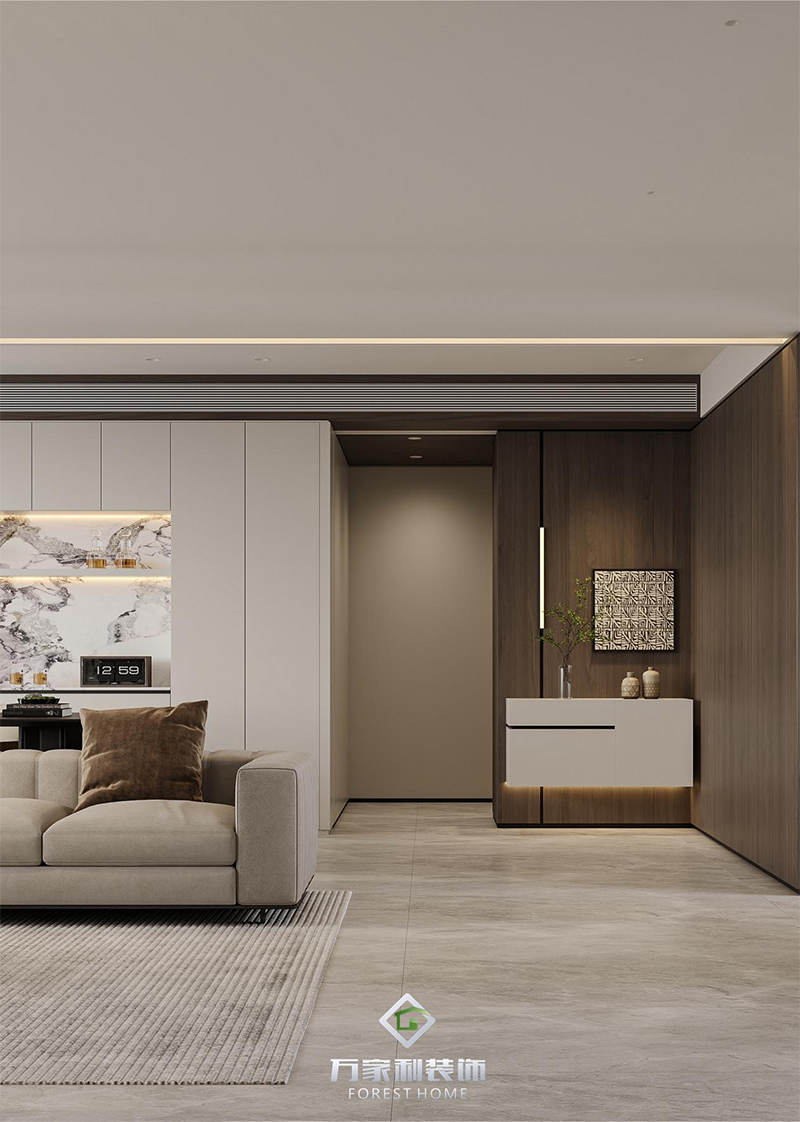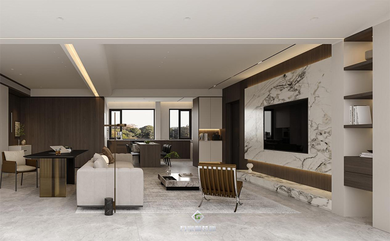 本案公區(qū)大面積采用整面大理石的墻上,為體現(xiàn)出空間的層次及造型上的融合。